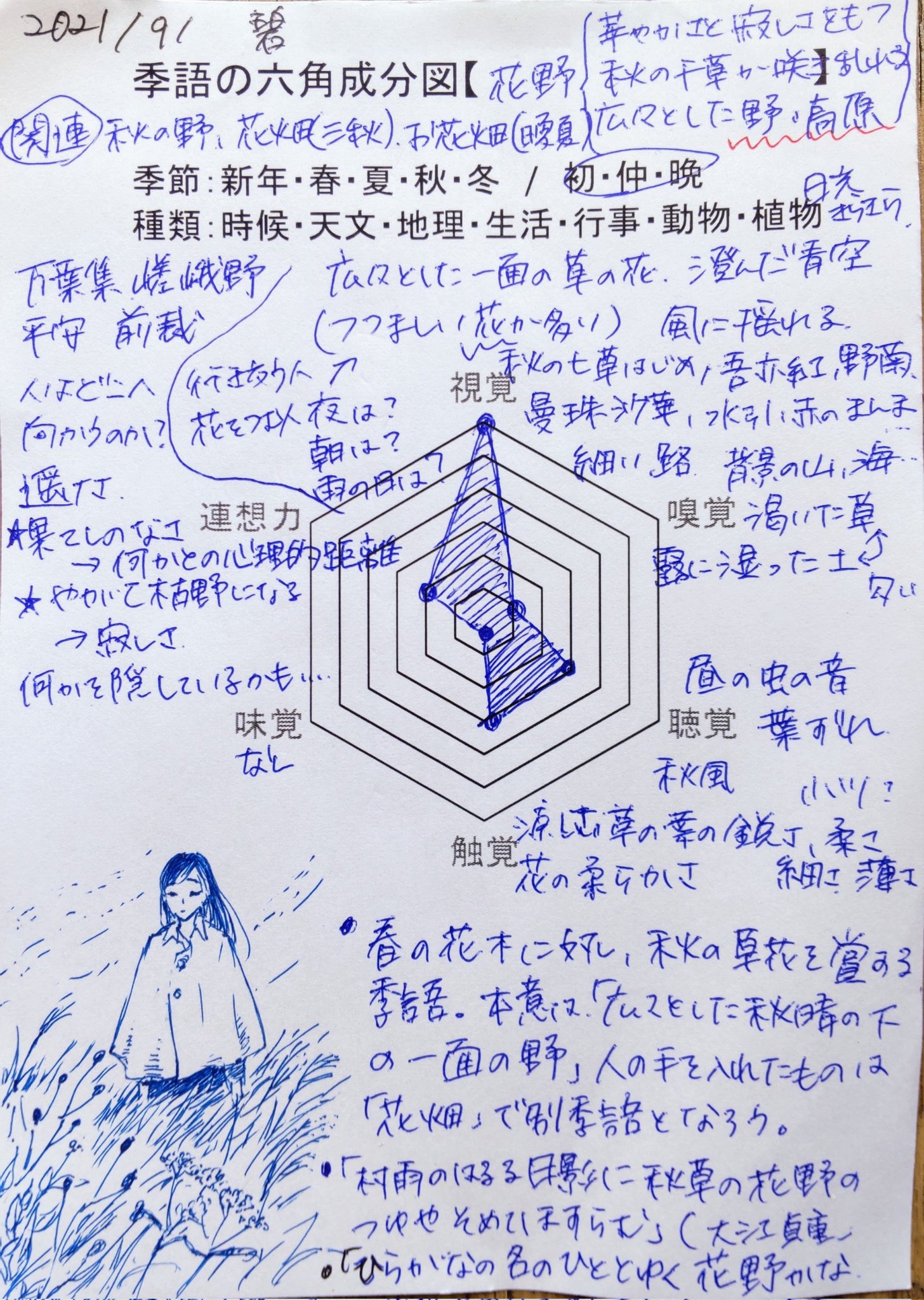 碧西里 季語六角成分図 花野 草の花が咲き乱れる広々とした自然の野原 高原 華やかでありながら慎ましやかで 秋らしい寂しさも伴う 題としては奈良くらいから好んで詠まれたが 花野という言葉として定着したのは鎌倉の頃から 野菊や七草